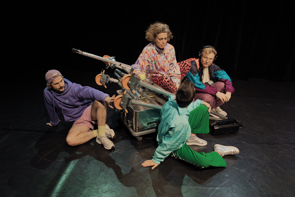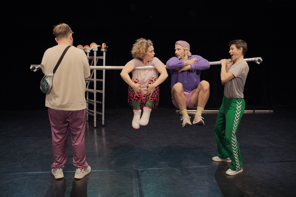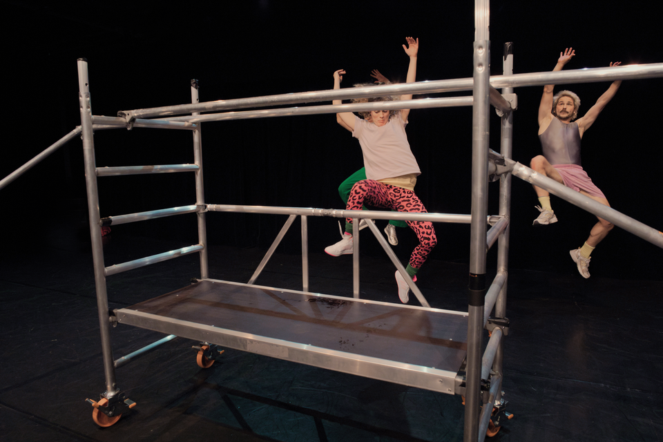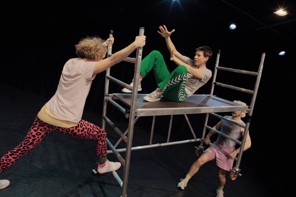 Wer sind wir als Individuen? Was ist unsere kollektive Identität? Wie viel Raum nehmen wir ein und wie wird dieser Raum über Körper, Stimme und Musik geformt und verhandelt? Drei Tänzer:innen und ein Musiker docken an mit Baugerüststangen und Gerüst und erschaffen so Momente, in denen sie sich annähern, Raum einnehmen und diesen verwandeln.